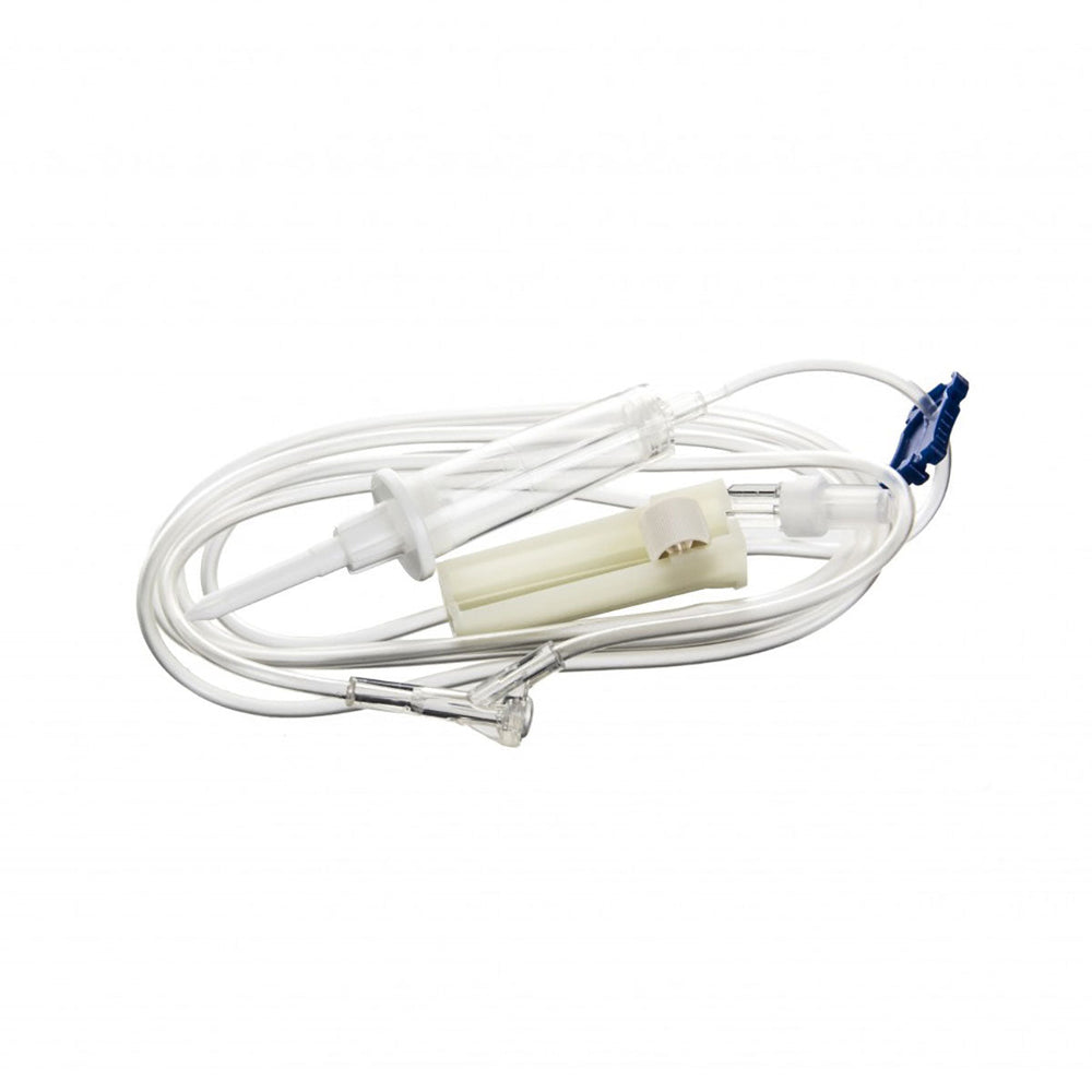 The system includes a 15µm filter that removes particulates, while the Y-injection site allows secondary medication administration without disconnecting the primary line. The roller clamp lets professionals adjust flow rates accurately, and the click luer rotary connector with Safeprime cap reduces contamination and air embolism risk during setup.